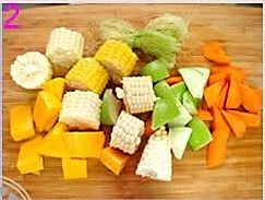 南瓜、玉米、青苹果、胡萝卜、西红柿处理成适当大小,玉米须打结;