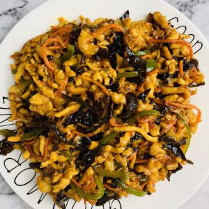 所有食材准备好:鸡胸肉,辣椒,木耳,胡萝卜切成洗丝,葱姜蒜切末备用。