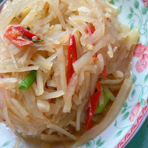 倒入切好的土豆丝翻炒 放少许盐 鸡精 40粒,生抽少许