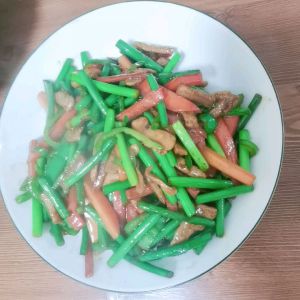 蒜苔切段,胡萝卜里脊肉切条(不要太细)青椒切细条,姜切细丝