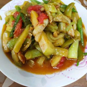倒入番茄和芹菜,倒入醋和蚝油。继续翻炒。