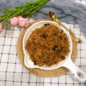 炒到半干,加入芝麻,继续炒,炒到成绒状,加入剪碎海苔