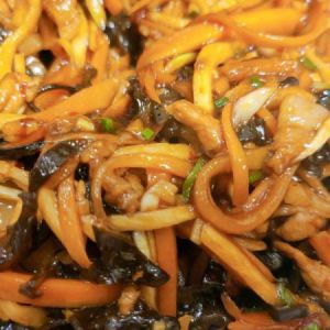 调的酱汁忘了拍照。酱汁配方:水、生抽、老抽、醋、糖、盐、淀粉、麻油调匀。各种材料煸炒熟(胡萝卜丝、茭白丝发软),倒入调好的酱汁,大火翻炒。