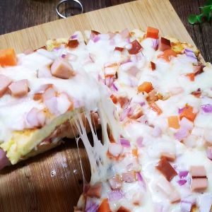 先抹上一层披萨酱,再撒上马苏里拉奶酪,然后再放上蔬菜丁,火腿丁,再撒上一层厚厚的马苏里拉奶酪,上下火全开了2到3分钟,是不是特别简单?