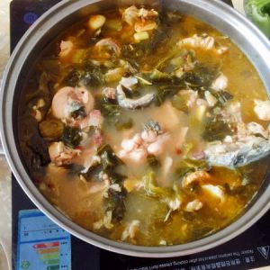 热油爆锅,先放葱花、蒜瓣、姜片、花椒爆锅,然后加入酸菜鱼调料里的酸菜爆炒,炒一小会儿觉的菜有点干的时候赶紧加入清水,放入鱼头鱼骨炖,水开后加入调料包里的辣椒和其他调料。开锅后放入片好的鱼肉。