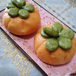 黄色面团分成每个60克的面剂子,擀成比包子皮稍厚一点的面皮