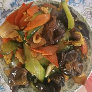 在放木耳,我这木耳用开水烫过,不用炒时间太长