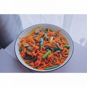 肉片翻炒断生后 ,倒入胡萝卜丝继续翻炒30秒左右