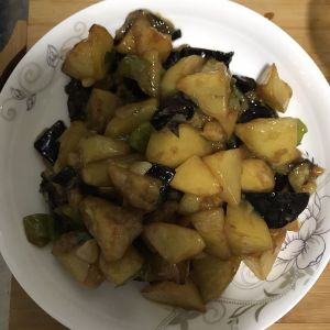 倒入茄子、土豆、青椒翻炒均匀。