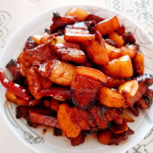 糖变色后倒入肉开始炒制,炒到肉变成金黄色,煸出油,(如果油特别多的话,可以用勺子称出来,)