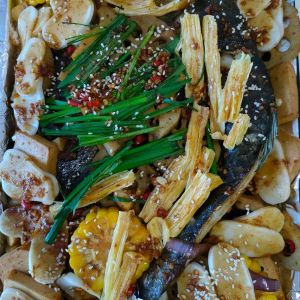 7.烤半小时的鱼上面铺上所有配菜,继续烤10分钟