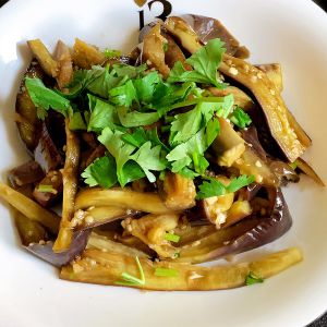 蒸好的茄子过一下凉水,再挤干水分,放入盆中。