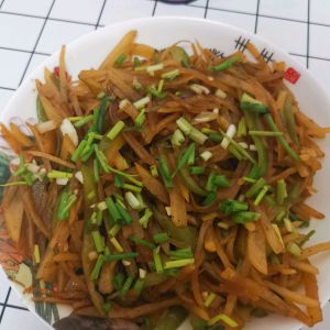 起锅热油,姜末,葱末,放入土豆丝翻炒,加入所有调料,翻炒均匀,大约三四分钟,放入柿子椒,翻炒到柿子椒不那么坚挺,出锅,再撒上点葱花