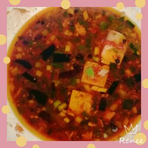 油汤开后,加切好的豆腐,加盐和鸡精,翻炒均匀。几分钟后,豆腐熟后,加水淀粉,翻炒均匀。起锅前加葱花,加花椒粉,出锅!