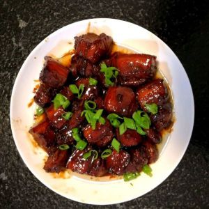 依次加入料酒,生抽,老抽(或者红烧酱油),耗油,再点一点白酒。老抽不要太多不然颜色发黑。盖锅盖焖五分钟,防止白酒挥发