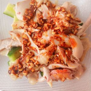 切好的黄瓜装盘,把晾凉的鸡腿撕成丝或者块都行