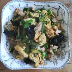 把鸡蛋打散,黄瓜切片薄一点。木耳如果朵比较大可手撕一下。里脊肉切薄片。香葱切段。