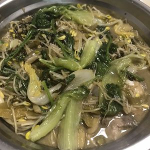 花椒瘦肉芹菜大葱等热油下锅炒均匀 再放入酸菜炒均匀 放入适量盐油 放入水烧开 多煮一会 煮出酸汤味 再放入白菜 豆芽 金针菇等煮熟捞起来装盘