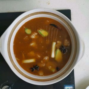 大火烧开,放盐,干辣椒,陈皮和山楂。最后别忘了顺着砂锅盖滴一圈高度白酒(我用的67度衡水老白干!)