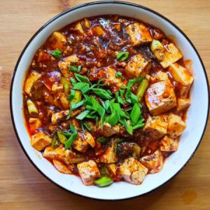 中火煮3分钟左右,汁烧的少了后,分三次勾芡,每次倒芡汁时都要慢慢推几下豆腐。转小火撒入蒜苗段,1.5克花椒面,推动几下,然后关火。