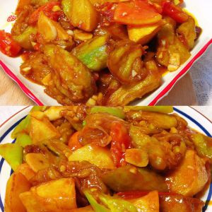 锅中留少许底油葱段蒜片炒香,➕西红柿丁翻炒出汁➕事先调好的一碗料汁炒至浓稠下入土豆茄子块快速翻炒,倒入蒜末翻炒均匀,家里有不吃辣椒小朋友这一步就可以盛出一部分装盘撒香菜末了,锅中剩余部分➕入辣椒段翻炒均匀即可出锅装盘,这样一锅做双口味的地三鲜就做好了,香辣鲜甜适口米饭好搭档哦,喜欢的赶紧试试吧。