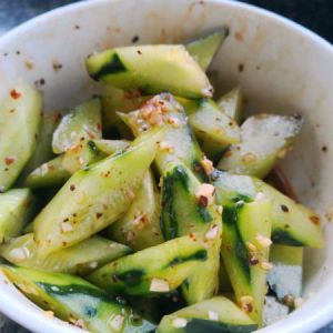 黄瓜从中间劈开,拿出一半从中间再切一刀,然后切成菱形块盛碗里