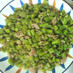 猪肉剁成沫,两瓣蒜,四季豆摘掉头尾切成图片大小