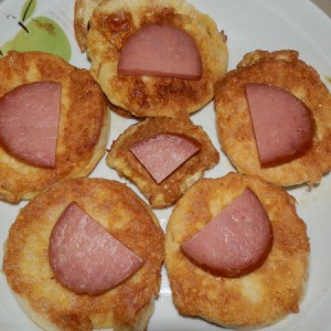 油温变热,改小火,裹上蛋液的馒头片,逐个整齐的放入油锅