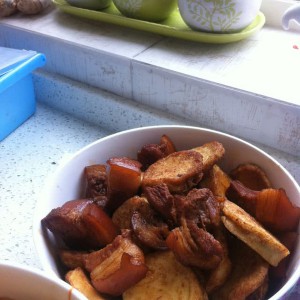 倒水淹过肉,放入酱油,盐,酱油多放一点,一个八角,大火烧开,放入素鸡转小火煮,最后起锅