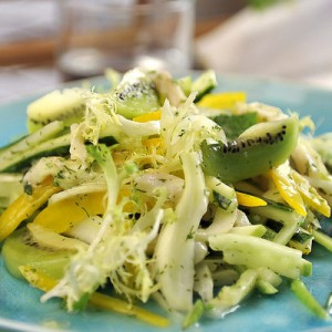 在盘中可随意摆放各种食材,在上面放上猕猴桃。如果你已经把鱼加入,就尽快品尝吧,不然鱼肉就会被青柠檬的柠檬酸煮过头了。在享用时,记得要将所有食材混在一起咀嚼。