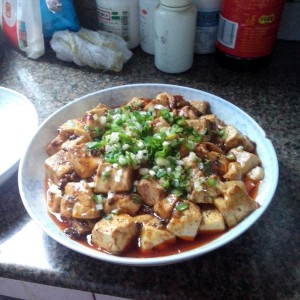 把油烧开加葱姜蒜末 抄出香味加豆瓣酱 把沥干的豆腐饭入锅中上色