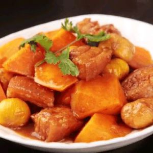 然后揭开锅盖,淋入料酒翻炒均匀,再倒入红薯块、板栗,拌匀,之后再盖上盖,用小火煮约20分钟,至食材熟透。