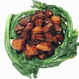 青菜用水煮熟捞起摆盘,煮好的五花肉放在盘中,色香味俱全的五花肉就好了