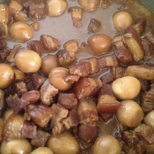 小火炖至1时,加入适量盐(依据个人口味)和鹌鹑蛋继续小火炖至1小时。这里我加入了香菇一起炖。