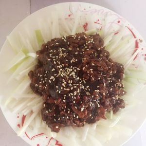 热锅冷油,肉丝从冰箱拿出倒入、炒变色后乘出、锅内留油,将甜面酱倒入,炒两分钟再倒入葱姜水放入料酒、鸡精、糖,炒粘稠后倒入肉丝翻炒片刻、盘子底部铺上大葱,肉丝出锅、香气四溢,撒上白芝麻或小葱末、完成。我喜欢卷饼吃,十分美味的菜肴可搭碗粥!