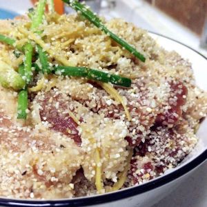 红薯煎至外表焦黄,我家刚好还有几块油豆腐就一起垫底了。肉片在米粉里打个滚,沾满米粉