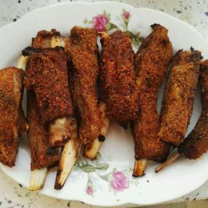 羊排洗净,圆葱切丁,放入盐、料酒、辣椒面、孜然粉、胡椒粉。