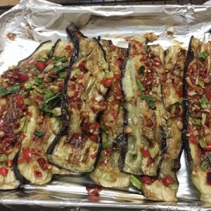 到时间后出烤箱撒上味汁再烤制10分钟出烤箱撒上葱花就可以了,香喷喷的烤茄子,好吃极了