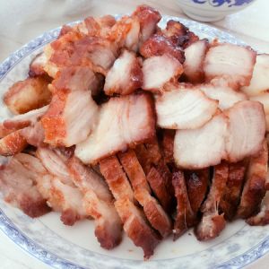 五花肉浸了一晚上乳汁,第二天中午可以串起来烤了。先用烤箱的普通烤模式,无需转烤(因为五花肉要先收一下,不至于转烤甩开甩去。)烤好拿出来刷上乳汁,继续转烤。烤好再拿出来刷上乳汁,再继续转烤。中间看看五花肉的上色情况,避免烤过了。