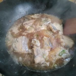 锅中倒油,待油热后放入鱼段,炸至金黄,再放入葱姜蒜末,最后倒入调料汁。