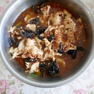 锅刷净倒油,等到油烧热到,稍稍冒烟的时候,关火。将热油均匀的倒在肉片上。
