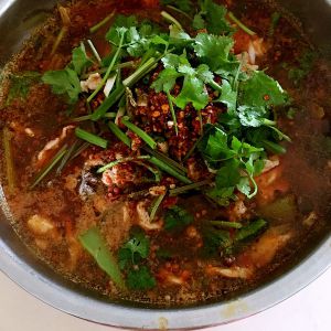 肉熟了连汤倒入汤盘。上面撒上花椒粒、花椒粉、辣椒粉姜粒、蒜粒、几粒干辣椒!锅内放油烧热淋在上面。