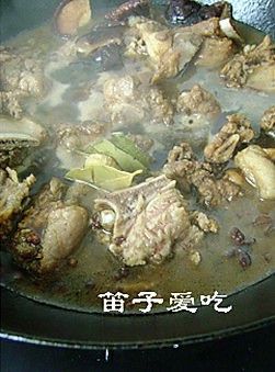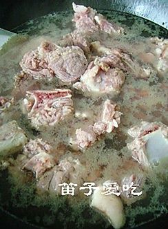 放入排骨翻炒均匀,倒入料酒,加入八角、桂皮、葱段、姜块,香叶,加入没过排骨的热水,加一勺醋,大火烧开后,小火炖,炖30分钟后加入老抽