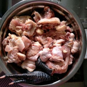 开始炒,先把葱姜蒜爆香,再放干辣椒,八角,炒一会,下鸡肉炒,放少许料酒,跟盐,爆炒,切记不能加水