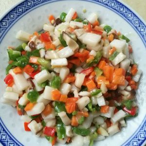 倒油五成热,炸葱蒜再放年糕和其他的食材,放调料后小炒下装盘。