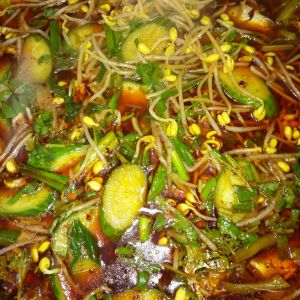 煮到水涨了之后放黄瓜豆芽进去煮,煮几分钟之后,就可以了。