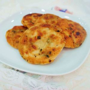 将煎好的饼放入烤盘中,然后进烤箱烘烤至表面变干(2面都要)这样,香喷喷的葱油饼就做完啦。