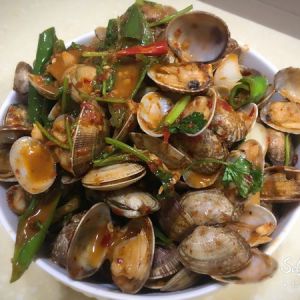 倒入花贝炒均 加入适量料酒 生抽 蚝油