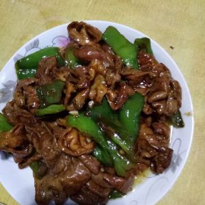 锅里放油,别太多,倒入肥肠和青椒翻炒