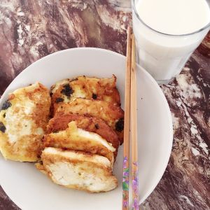 馒头片沾鸡蛋液,然后等锅里油热的七分的时候,把馒头放入炸,要小火慢炸